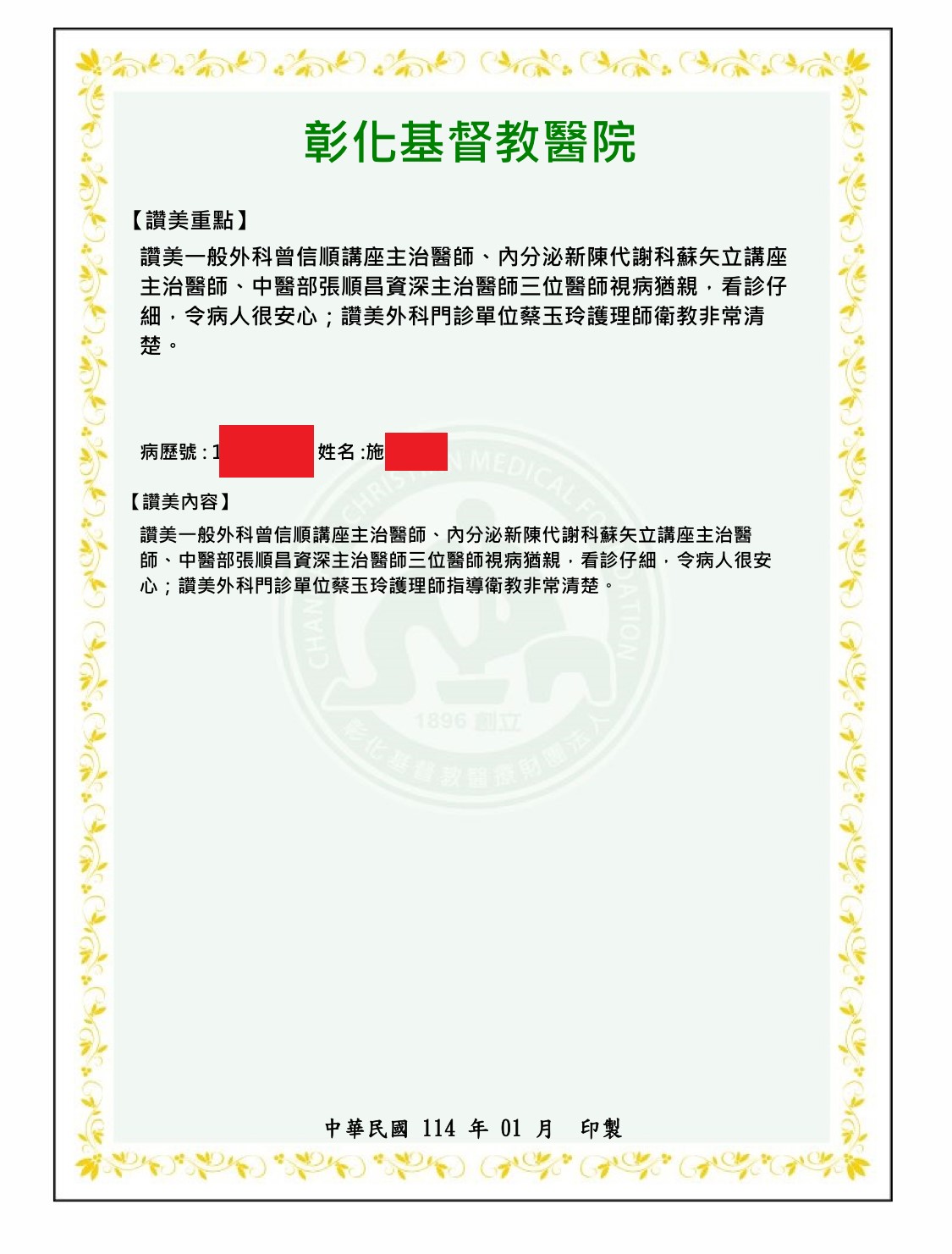 讚美 一般外科 曾信順講座主治醫師、內分泌新陳代謝科 蘇矢立講座主治醫師、中醫部 張順昌資深主治醫師 三位醫師視病猶親,看診仔細,令人很安心;讚美外科門診單位 蔡玉玲護理師 指導衛教非常清楚。