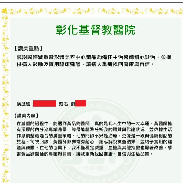 1、感謝國際減重暨形體美容中心 黃品鈞 備任主治醫師細心診治,並提供病人鼓勵及實用臨床建議,讓病人重新找回健康與自信。