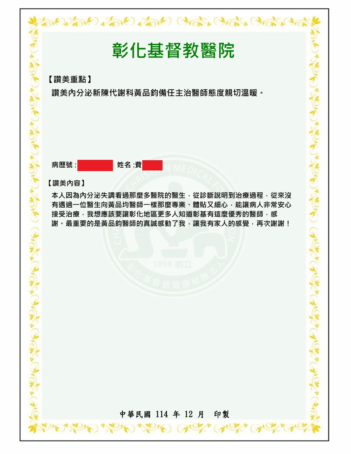 彰化基督教醫院 內分泌暨新陳代謝科 全體同仁 感謝您的讚美