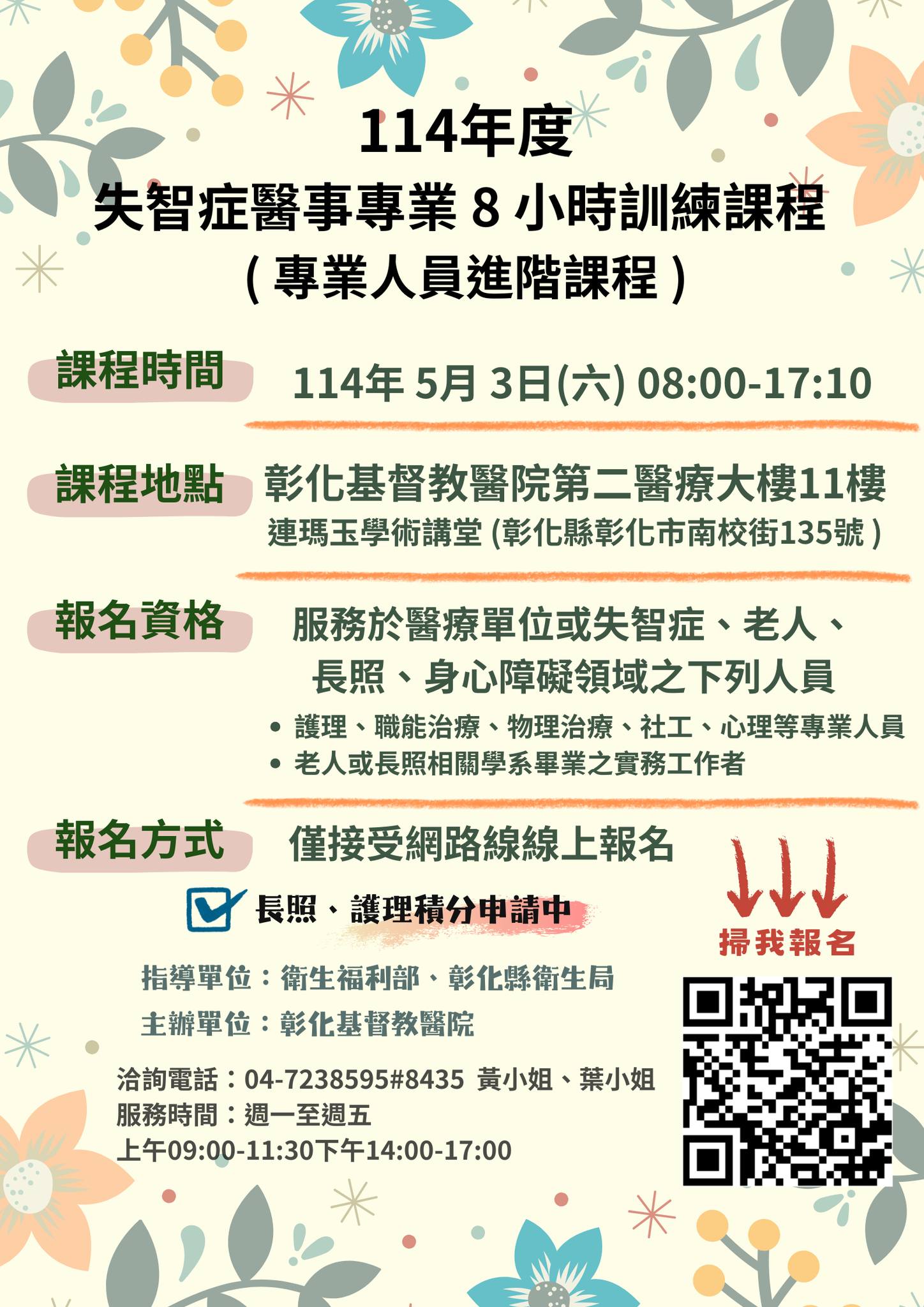 114.05.03(六) 失智症醫事專業 8 小時訓練課程(進階課程)