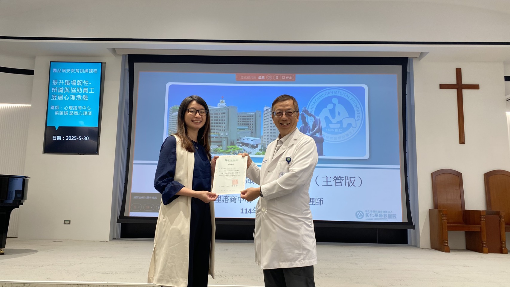 2025年5月30日醫品部舉辦病人安全教育訓練,由彰化基督教醫院心理諮商中心梁碩娟諮商心理師主講「辨識自我耗竭與提升韌性」。單位主管如何透過資源的引進-從個人擴大至群組、從院內延伸至院外-來協助及早助人或自助,以找出合適的 方式來緩解或消弭那些不適的感受,期以提升員工心理健康、共同打造健康的職場環境。