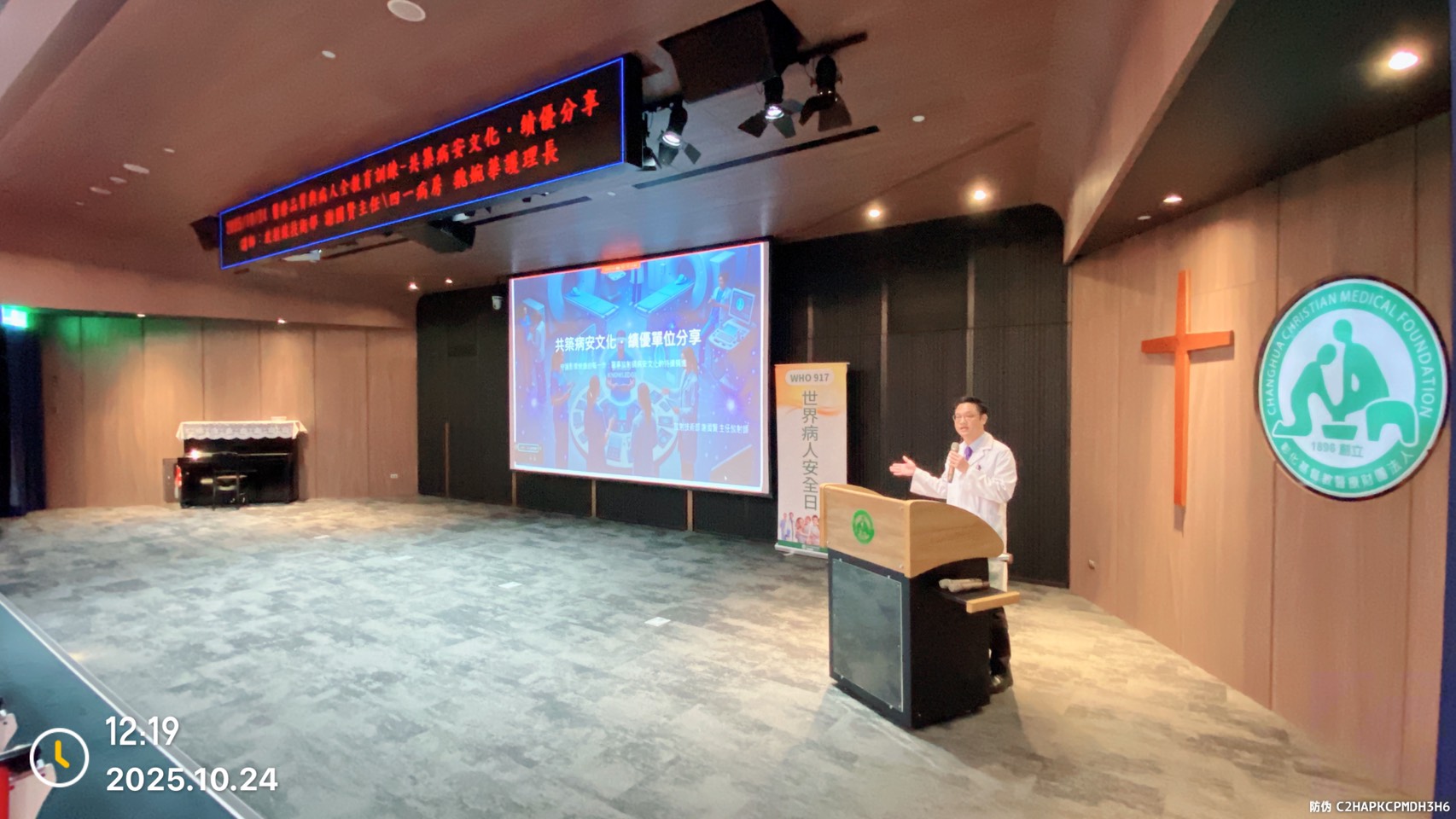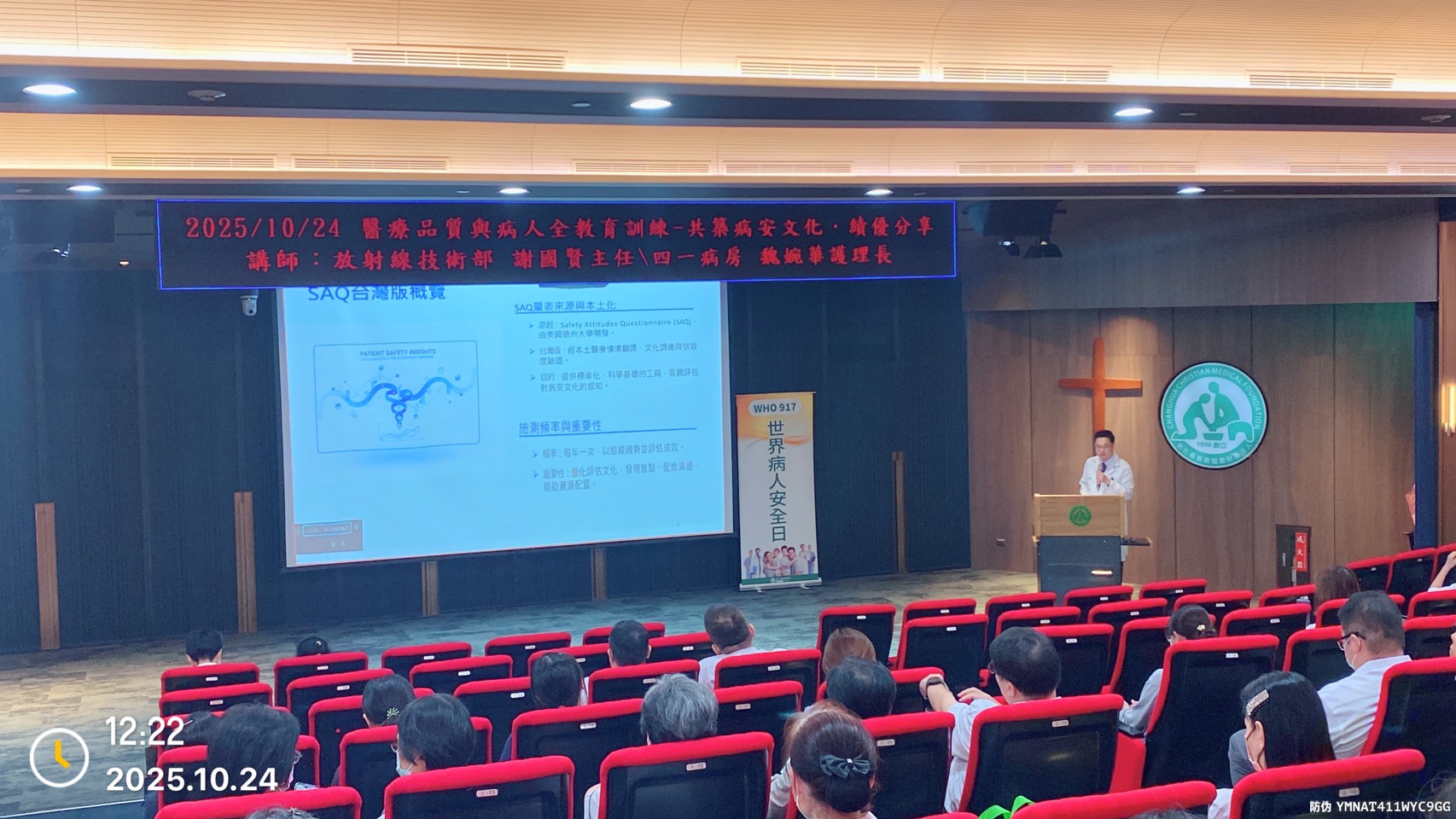 2025年10月24日醫品部舉辦病人安全教育訓練,由彰化基督教醫院婦產科暨嬰兒室 魏婉華護理長、放射技術部 謝國賢主任放射師主講「共築病安文化.績優分享」。魏婉華護理長分享管理策略與領導風格,強化病安文化認同,促進團隊交流與持續改善,提升醫療品質。謝國賢主任放射師分享醫事放射師從病人身分確認到影像上傳各環節守護病人安全,並透過流程、教育與文化推動提升整體病安績效。