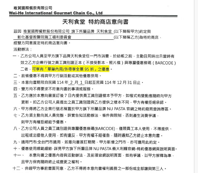 憑員工識別證優惠如下: 1.可享餐飲品項九折 2.生日當天〈含前後一天〉憑員工識別證及身分證及可享八五折優惠。 3.單次購買餐品禮卷滿一萬元即可送貳仟元禮卷。 ※本優惠內容,不得與其他優惠活動併用,過年期間不適用