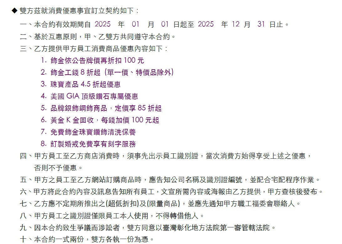 憑員工識別證優惠如下: 1.黃金、白金工資全面9折 2.鑽石珠寶(視品項)、黃金、白金回收(視純度)另行優惠,直接詢問店家 |