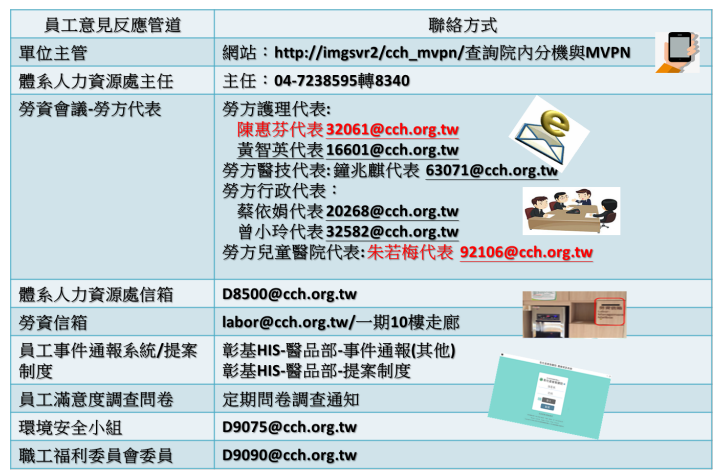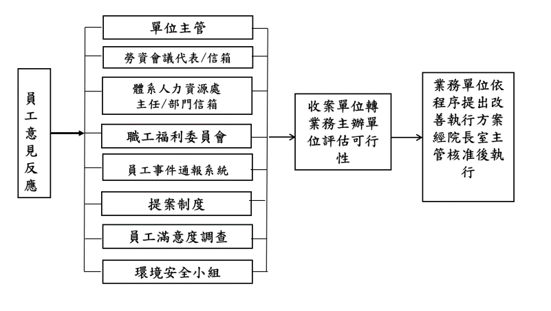 院內建立多元回饋機制,包括院內HIS系統、醫院網站、護理部網頁、員工滿意度調查、勞資會議信箱及讚美網,確保申訴與意見均有紀錄並公告處理結果,實踐公開透明。醫院訂有通報處理規範及標準流程,由人資處專責窗口與員工關懷小組進行調查與關懷,逐案檢討改善。
