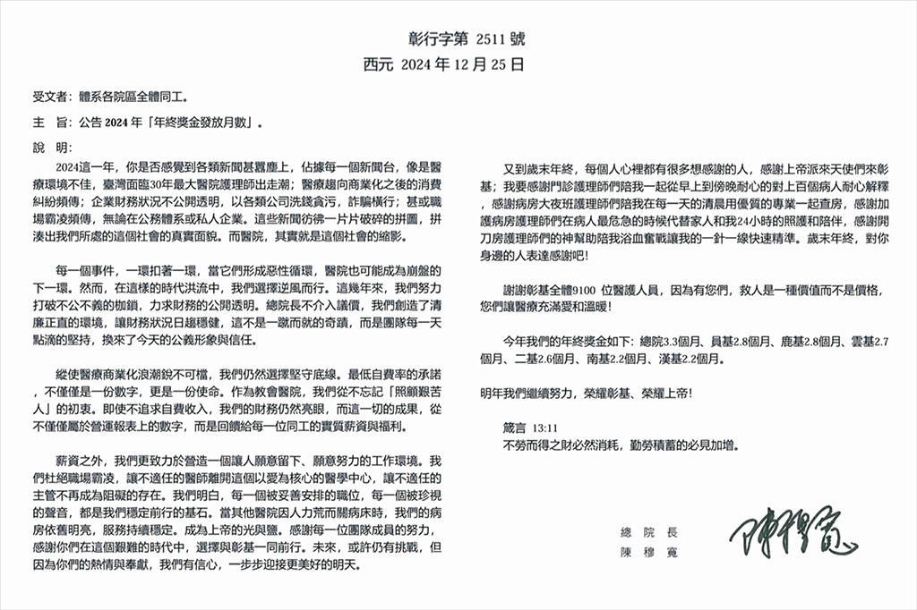 彰基醫學中心2024年的年終獎金政策,向外界展現其對員工的用心。