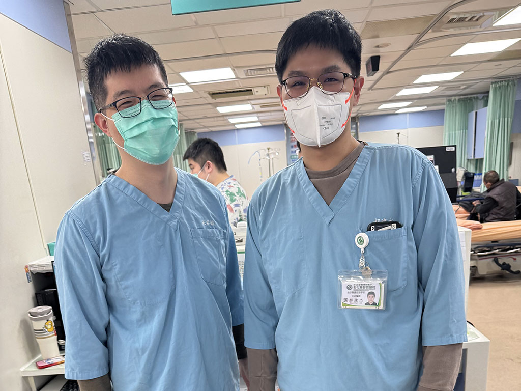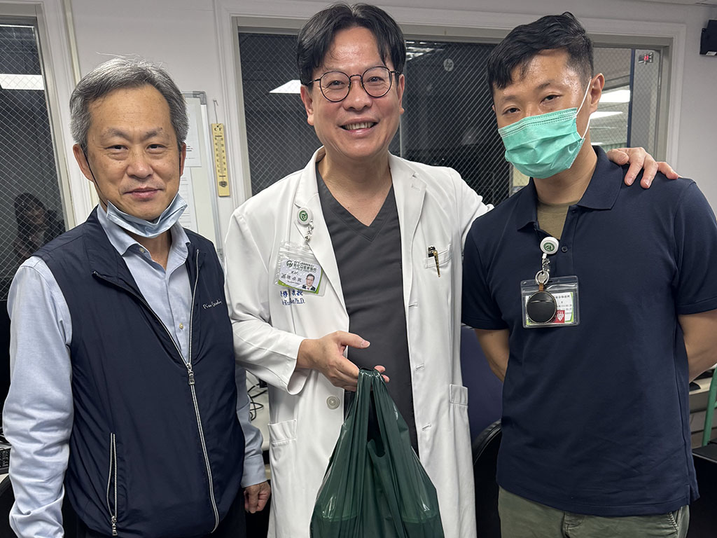 急診張家楷以及郝建杰(右)兩位主治醫師看到總院長陳穆寬六點多就前來急診關心駭客攻擊事件,雖然身體疲憊,但是都開心的笑了。