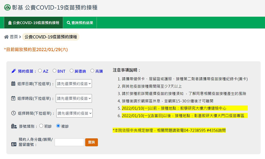 彰基醫療長張東浩醫師表示,國際疫情迅速變化,Omicron來勢洶洶,彰基於第一時間即完成「新冠疫苗」預約系統架構,方便民眾點選所希望施打的疫苗種類、日期及時間。民眾只要攜帶黃卡、健保卡,前來彰基疫苗專區,就可以施打。