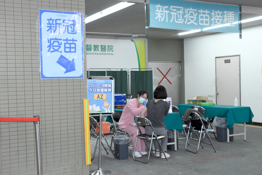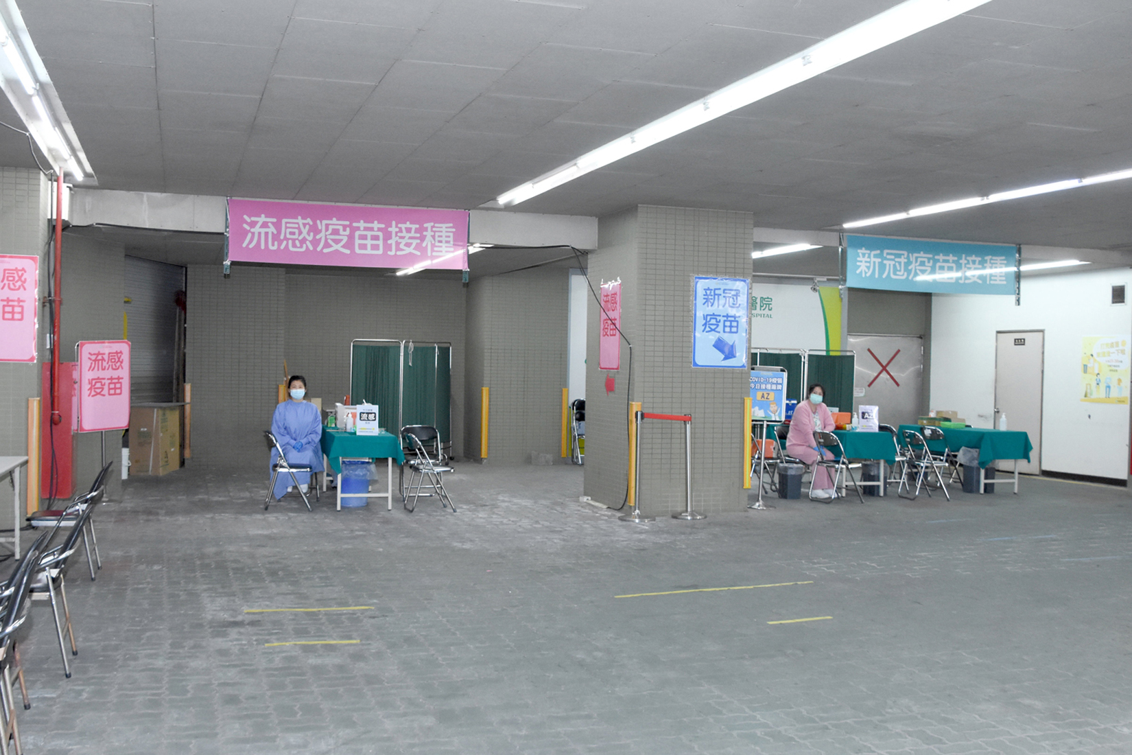「新冠肺炎疫苗」接種:藍色布條、標示海報、施打疫苗種類。
