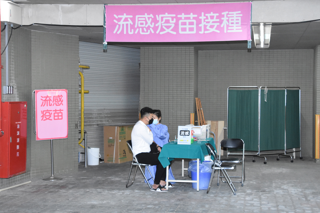 「流感疫苗」接種:粉紅色布條及標示海報。