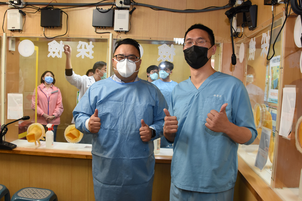 林晏任醫師(右)指出,採檢站全自動消毒系統,能使採檢站的防護零死角、運作速度提升三倍。