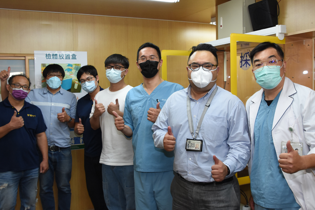 廖倫德博士(右一)表示,彰基COVID-19採檢站的全自動消毒系統,是全台灣第一套針對採檢站安裝的消毒系統。