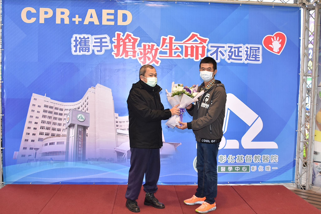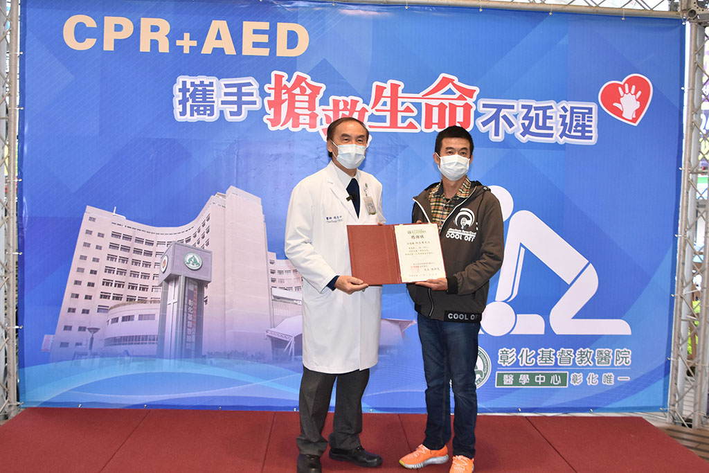 57歲男子左吉安,去年12月初於北斗夜市準備擺攤時,突然失去了生命徵象,熱心的長榮林姓女護生及其父親林各聲先生當下進行CPR(心肺復甦術),消防隊救護車人員接手急救與電擊,再前往卓醫院插管後,隨即轉到彰化、雲林、南投唯一的彰基醫學中心急診,經檢查、安置葉克膜、心導管室等緊急治療,終將左男從鬼門關前搶救回來。