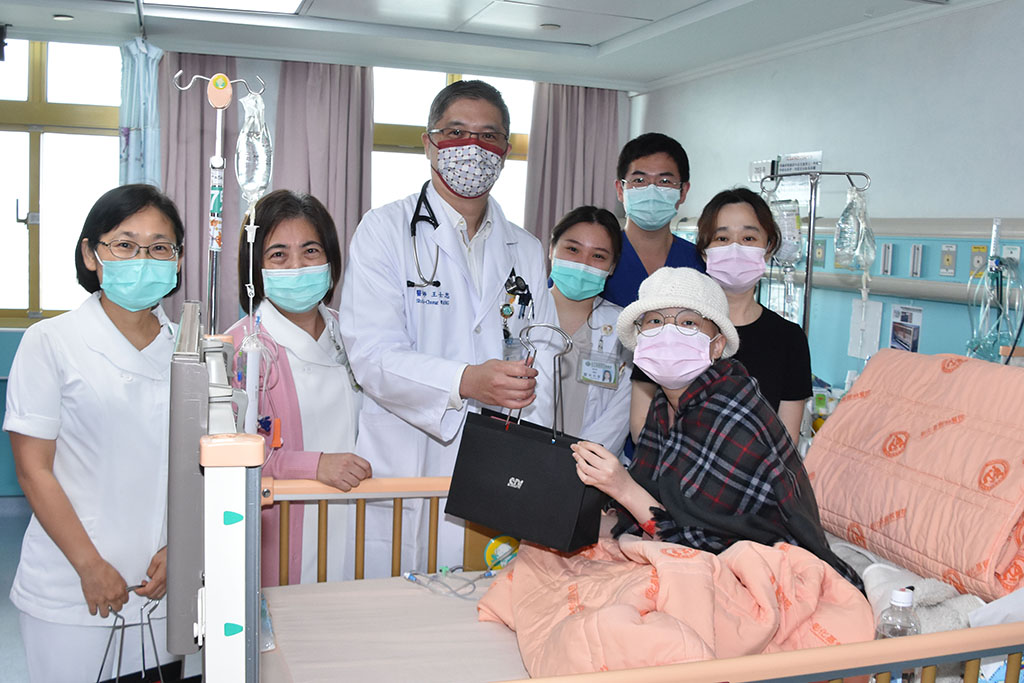 彰基兒童醫院兒科部主任王士忠醫師(左三)、護理部主任賴妃珍(左二)、護理長蔡美容(左一)及醫療團隊,將充滿愛心與溫馨的禮物送給小朋友。