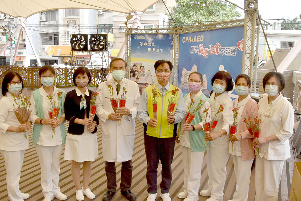 彰化市長林世賢(左六)致贈康乃馨,為彰基醫護人員打氣暨賀節。