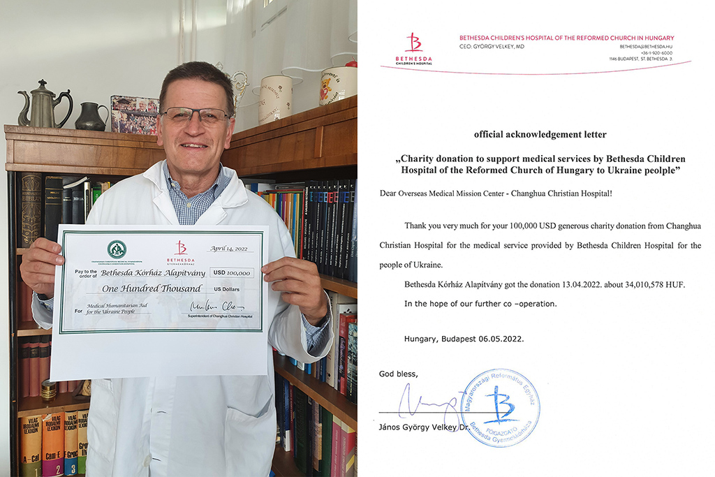 彰基醫學中心透過台灣基督長老教會總會教會與社會委員會引介,捐贈10萬美金協助匈牙利夥伴教會所屬之貝塞斯達兒童醫院((Reformed Church in Hungary (RCH)-Bethesda Children’s Hospital (BCH))購買醫療衛材物資,為逃到匈牙利境內及在邊界的烏克蘭難民提供醫療服務。彰基的愛心捐款帶著上帝的愛為貝塞斯達兒童醫院帶來甘霖,讓醫院有更多醫療資源幫助烏克蘭難民。