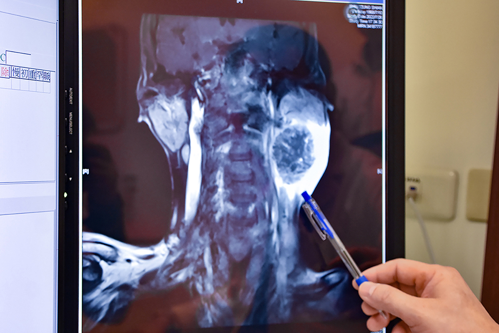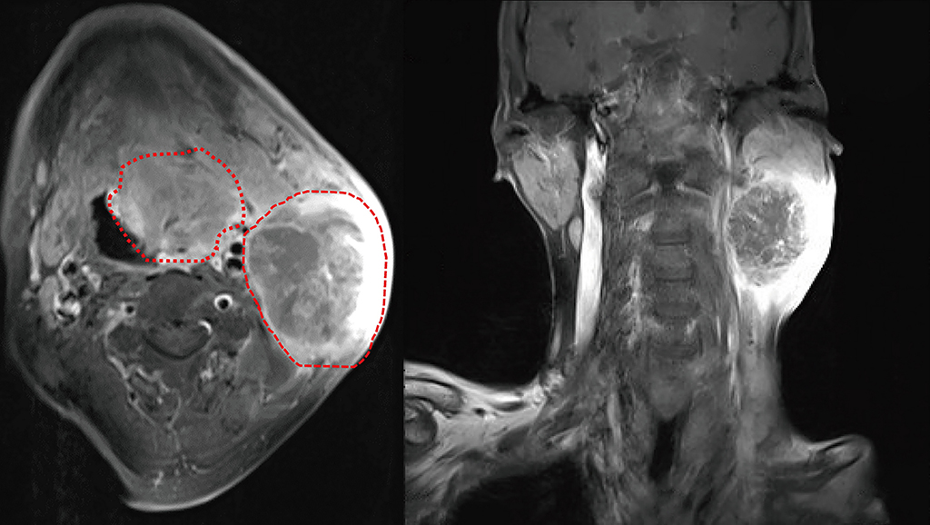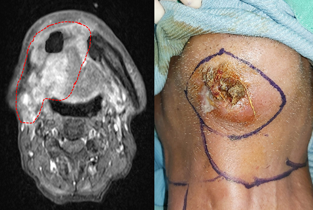 51歲男子因舌頭潰瘍,久而未痊癒。圖左為核磁共振顯示嚴重的腫瘤侵犯;圖右為癌症侵犯下巴骨頭及皮膚。