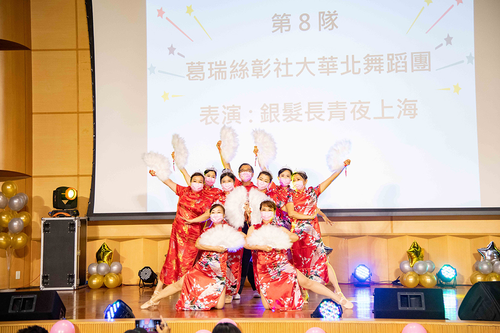 獲得金獎為「葛瑞絲彰社大華北舞蹈團」以優雅俏麗的旗袍裝及代表彰化特色扇形車庫的羽絨扇演出,以《夜上海》音樂配搭元極舞,成員中年逾古稀之眼科呂醫師強調「運動帶來活力與健康」不分男女,也讓此次活動更豐富多元。