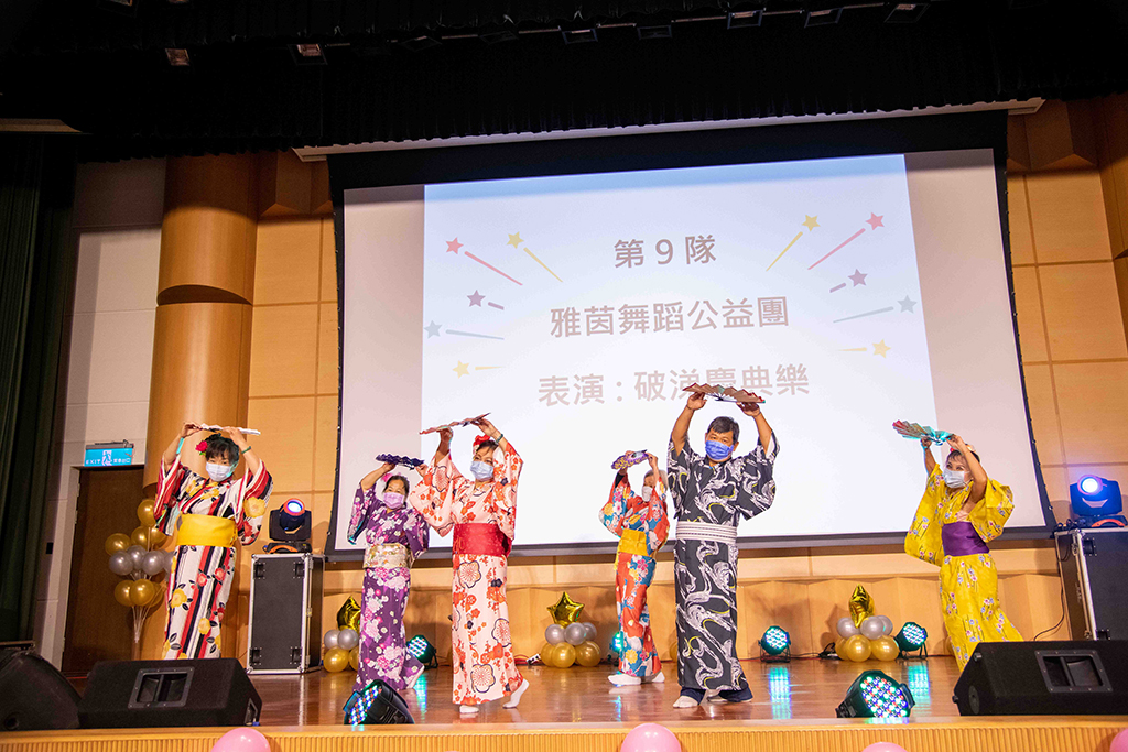 每隊表演隊伍無不卯足全力以健康活力表演互別苗頭,其中「雅茵舞蹈公益團」前段以優美的日本舞蹈搭配扇子表演,音樂一轉《東京盆踊》後只見阿嬤阿公像小女孩一樣可愛的拍手轉圈,展現高興跳舞的心情,90歲阿蓮阿嬤更輕鬆的前後劈腿,柔軟的身形讓現場大家自嘆弗如,搏得了滿堂彩。