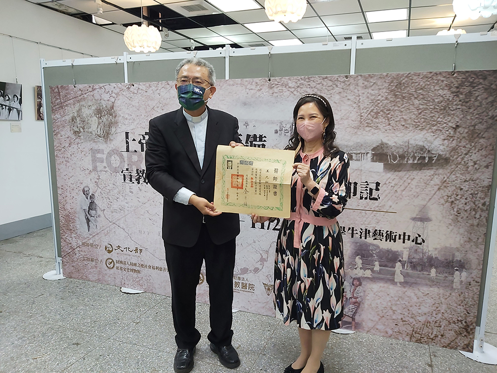 真理大學校史館主任王榮昌牧師(左)於開幕禮拜中,將祖父王光?的醫師證書,捐給彰基文史博物館。