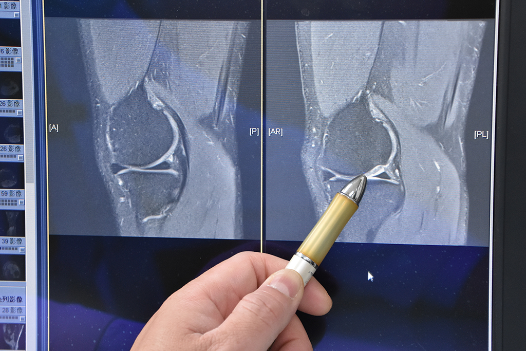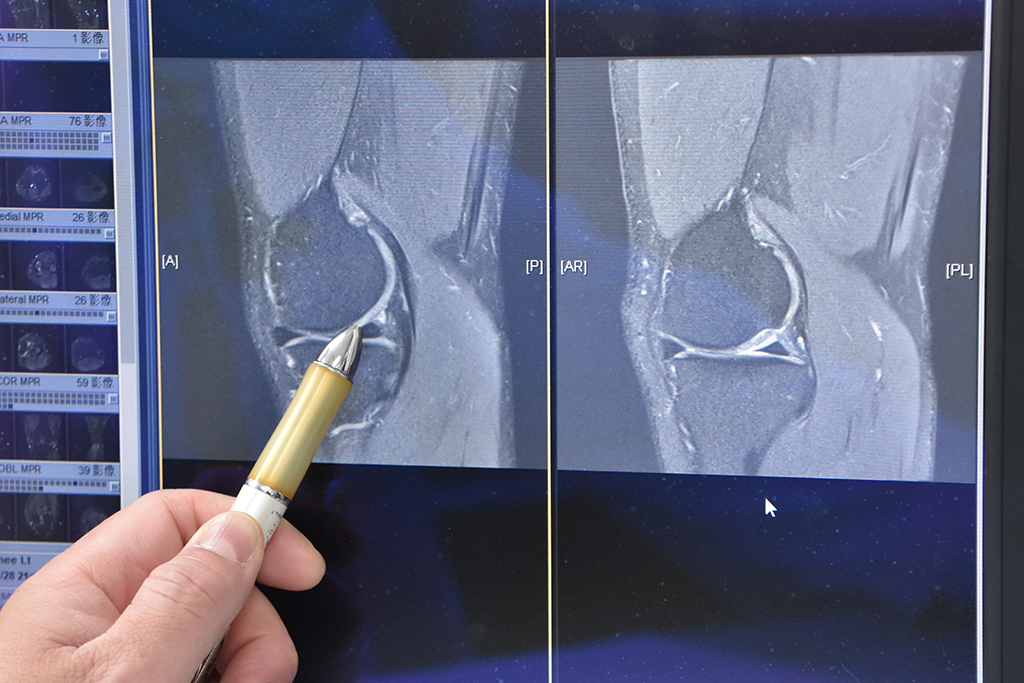 患者軟骨層片移植前核磁共振影像(右圖),軟骨與關節已經分離,產生關節面的一個缺損。