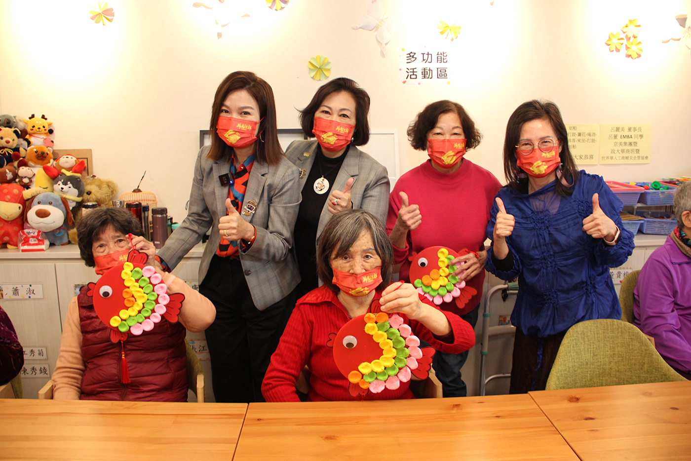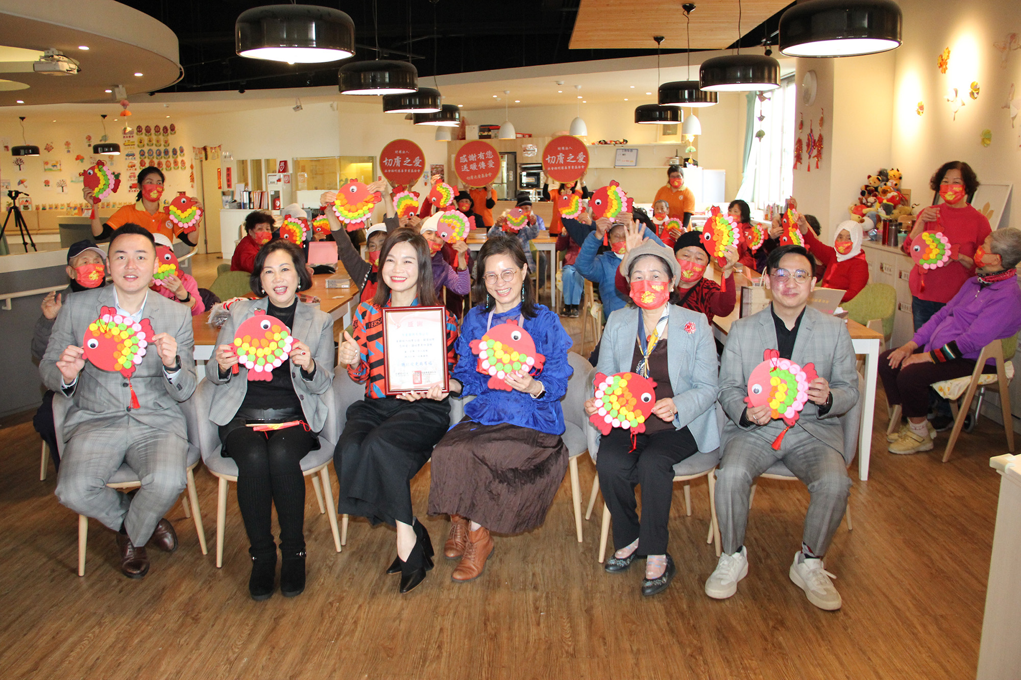 貴賓們陪伴長輩們一起完成「年年有魚」作品,意寓著連瑪玉學苑全體長輩祝福京美集團賺大錢「年年有餘」。