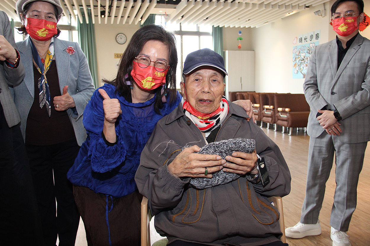 黃喜爺爺收到詹麗珠執行長致贈的手套與毛帽,臉上洋溢著幸福的微笑。