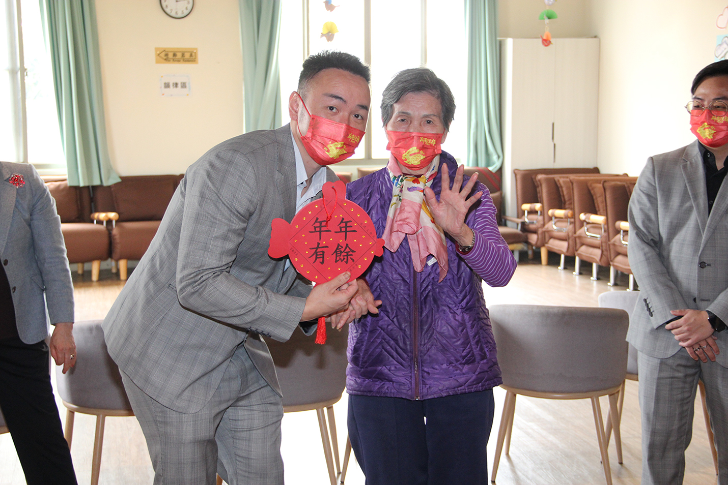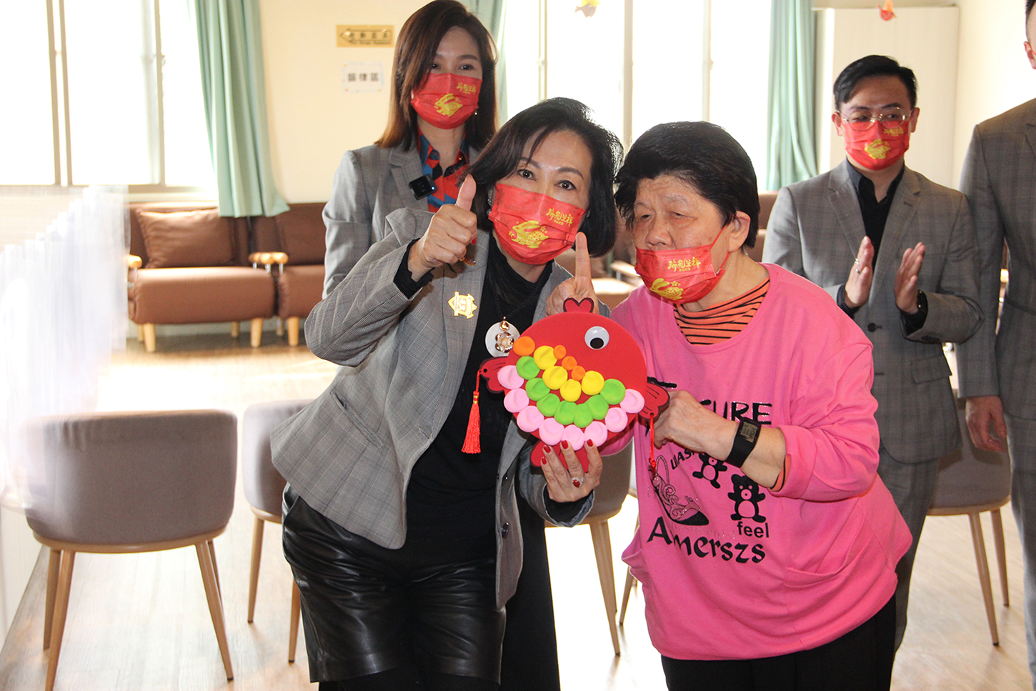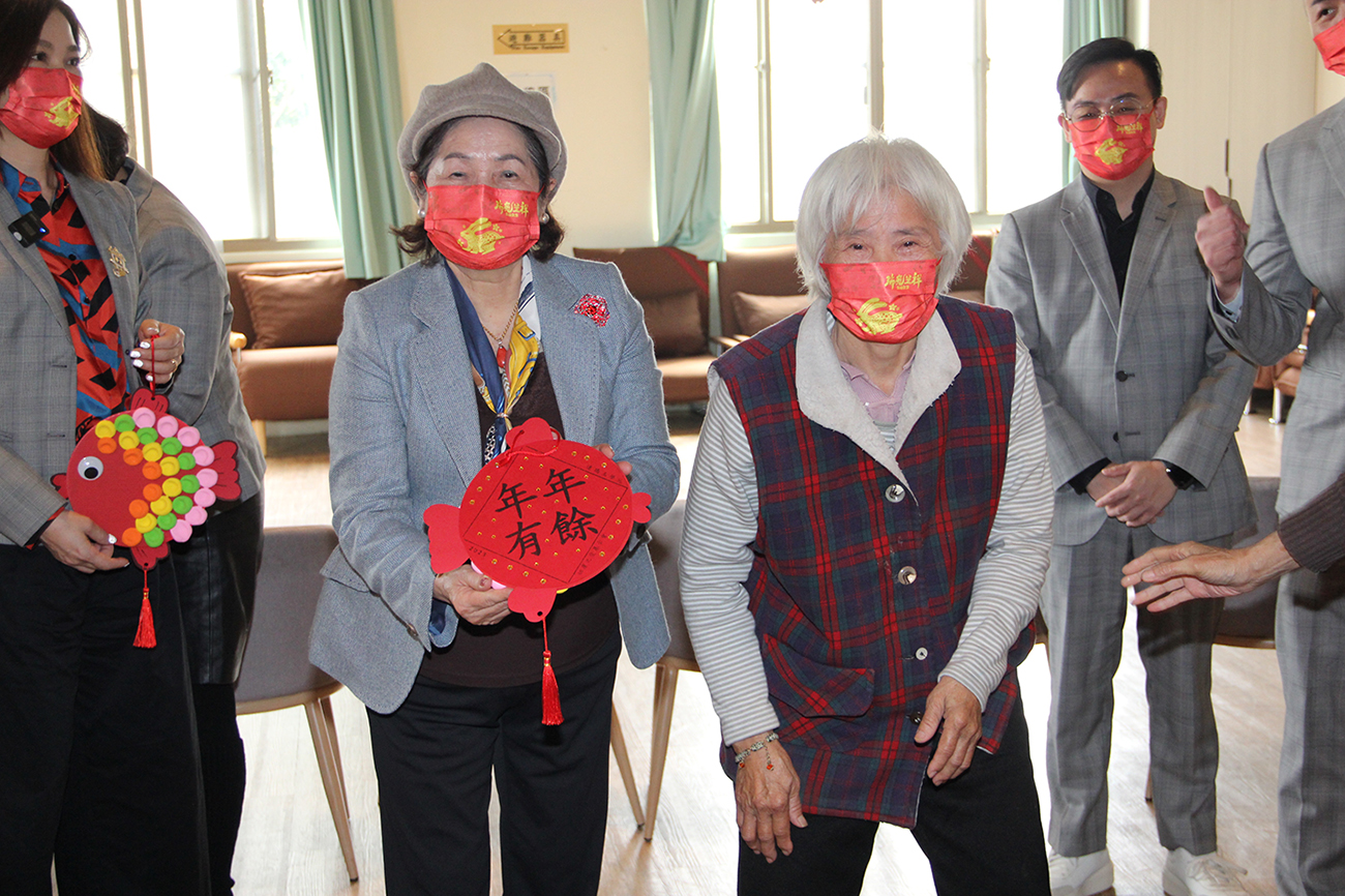 日照中心最高齡的97歲黃喜爺爺,特別用珍藏60年的口琴即興演出,歡迎並感謝貴賓們不顧路途遙遠前來關懷,精彩的表演博得滿堂喝采。隨後,貴賓們陪伴長輩們一起完成「年年有魚」作品,意寓著連瑪玉學苑全體長輩祝福京美集團賺大錢「年年有餘」,也期盼「台北美麗頭家娘」每年記得帶著滿滿的愛,回來探望老寶貝;京美集團也回禮贈送每位長輩高能量多功能圍脖,並由呂董事長逐一為長輩佩戴上,祝福大家身體健康。