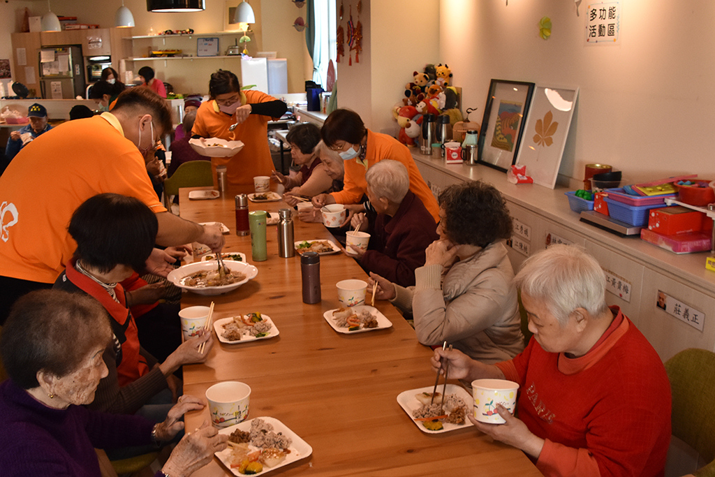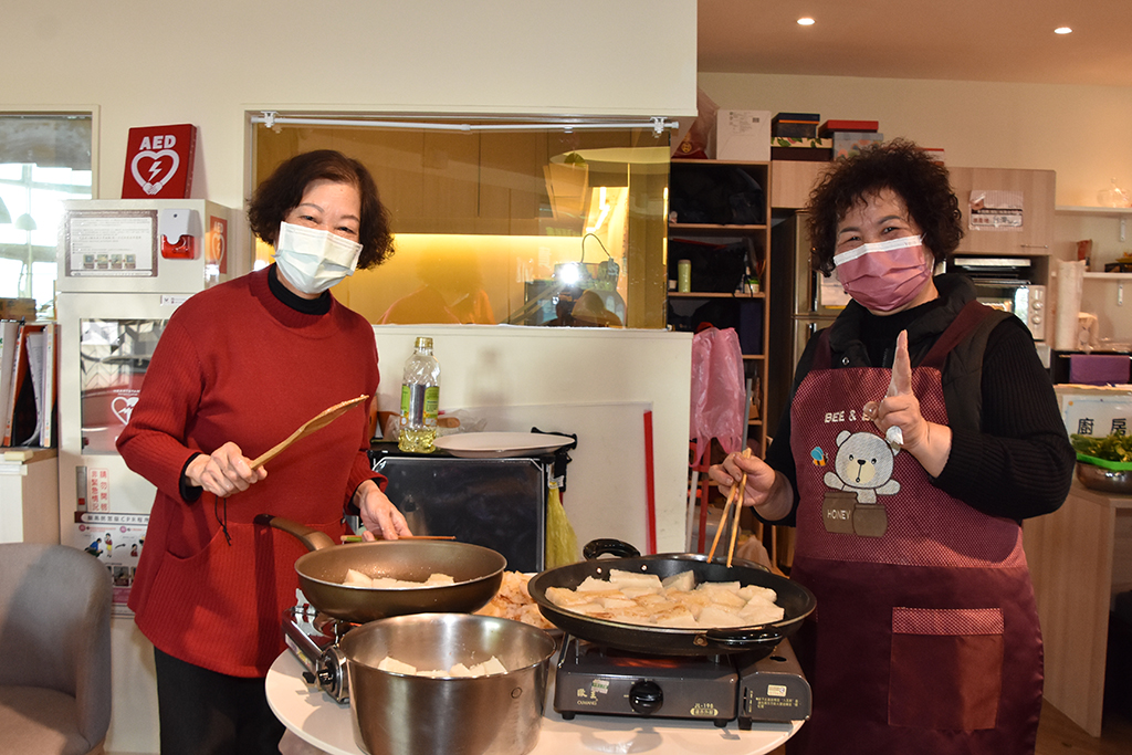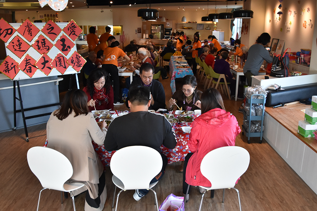 當天菜色中,最值得一提的是「蘿蔔糕」,那是長輩們於圍爐前一天親手製作的,學苑志工媽媽更是煎得一手好糕,蘿蔔糕散發出清新的香氣,讓人不禁垂涎欲滴;另,學苑照顧服務員依照長輩的牙口狀況,分別準備軟硬不同質地或剁碎的食物,再再的顯示「連瑪玉學苑」的細心、貼心與窩心。