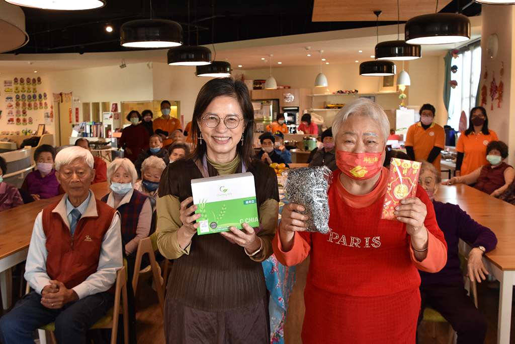 詹麗珠執行長(左)致贈營養食品及兔年金幣紅包袋,長輩開心的笑瞇了眼。
