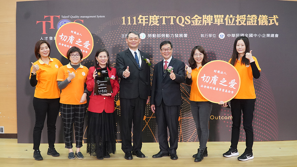 切膚之愛基金會重視人才培育與發展,透過明確的訓練政策,強化員工認知與認同,自民國98年起開始導入勞動部人才發展管理系統(TTQS),建構系統化的管理,精進人才永續發展價值,榮獲「111年度TTQS人才發展品質管理系統評核」金牌肯定,並創下社福界唯一勇奪10面金牌之紀錄,22日北上出席勞動部勞動力發展署頒獎典禮授證。