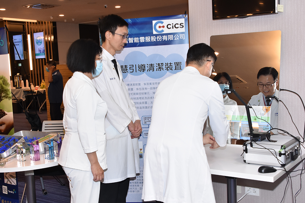劉森永醫療長(右)親自使用彰基所研發,並已技轉醫材廠商商品化的「智慧引導清潔裝置」。