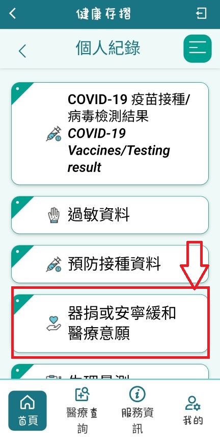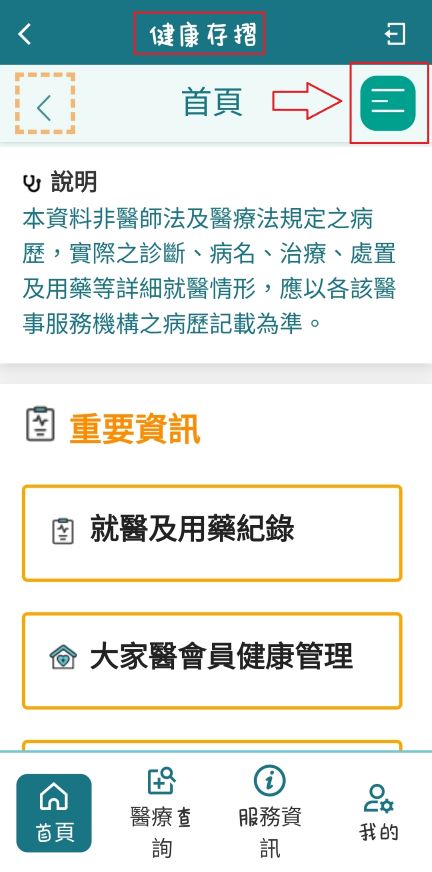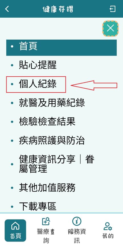 進入健康存摺 首頁右上角三條線→點選「個人紀錄」,