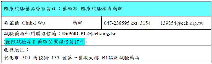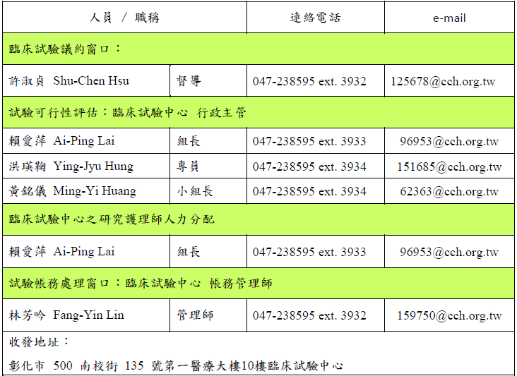 臨床試驗中心提供一條龍服務,包括:提供臨床試驗前諮詢、進行試驗可行性評估、送審臨床試驗計畫、臨床試驗費用報價與合約簽署、執行臨床試驗計畫、監測/稽核臨床試驗進度/遵循、管理臨床試驗計畫/經費。相關聯絡窗口如下: