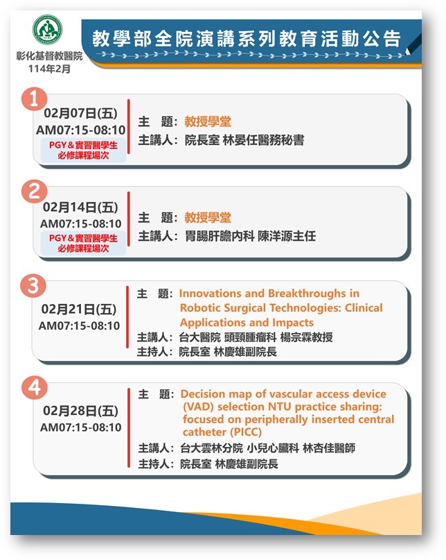 114年02月07日彰化基督教醫院 院長室 林晏任醫務秘書演講,主題:教授學堂