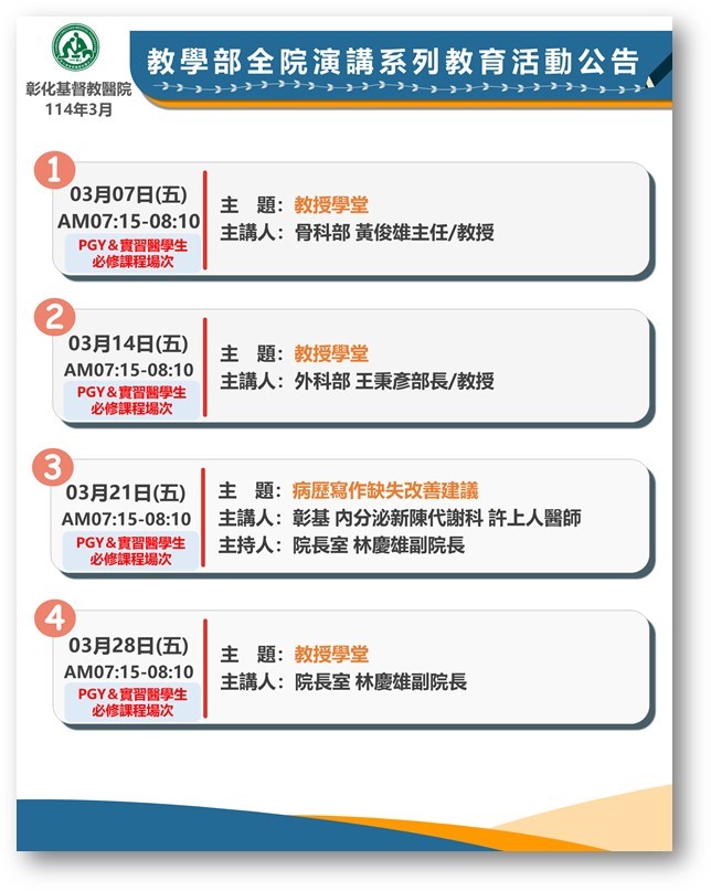 - 114年03月14日彰化基督教醫院 外科部王秉彥主任/教授演講,主題:教授學堂