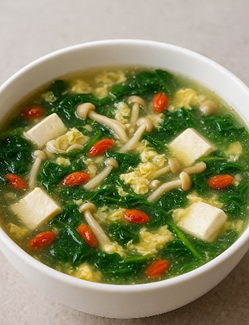 - 備料-將莧菜洗淨切段成適口大小(若牙口不佳者可分葉菜與根部分開烹煮);枸杞沖淨泡軟;鴻喜菇切除根部撥散;豆腐切小塊;雞蛋打散,備用。