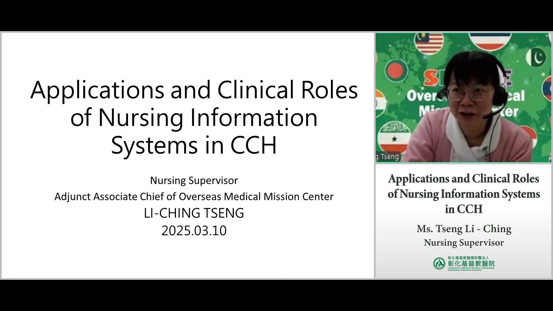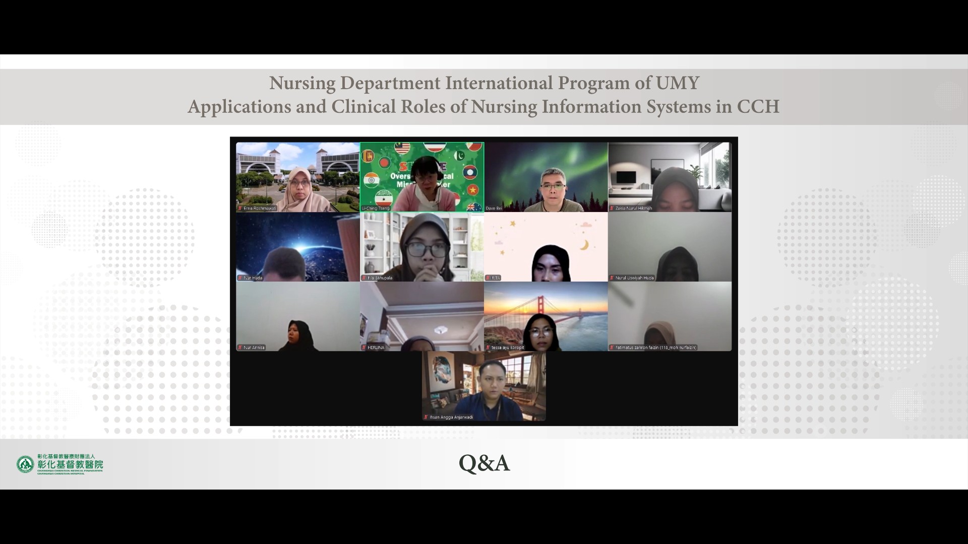 On March 10th, 2025, Changhua Christian Hospital (CCH) and School of Nursing of Universitas Muhammadiyah Yogyakarta(UMY), Indonesia, co-host the online course. Ms. Li-Ching Tseng,Supervisor of Nursing Department of CCH, was invited as a lecturer to share the "Applications and Clinical Roles of Nursing Information Systems in CCH". Around 30 teachers and students joined the online course and interacted with the lecturer very actively.